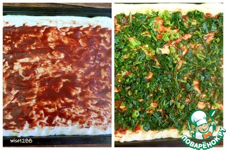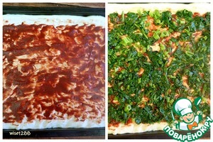 Смазать тесто томатной пастой, разложить шпинат.