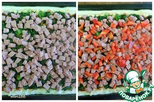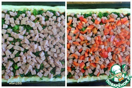 Затем разложить колбасу и сладкий перец.