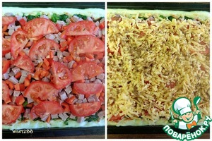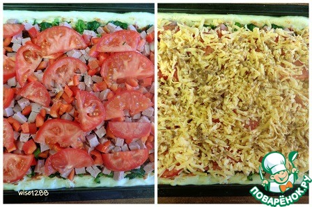 Сверху распределить полупластики (пластики) помидор, завершить слоем сыра и ароматизировать приправой для запеканок (пиццы).