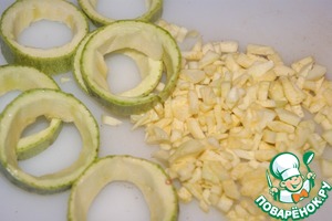Точно также поступить с кабачками, только нарезать их тоньше, не больше, чем 1 см. Мякоть кабачка добавить к мякоти баклажан.