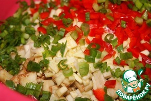 К нарезанной мякоти овощей, добавить мелко нарезанный красный перец и зеленый лук. -