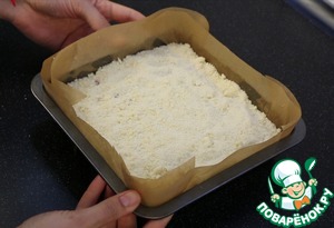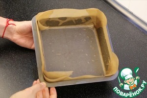 Выпекать буду в форме размером 20*20. Дно и бока смазала растительным маслом и проложила пергаментом.