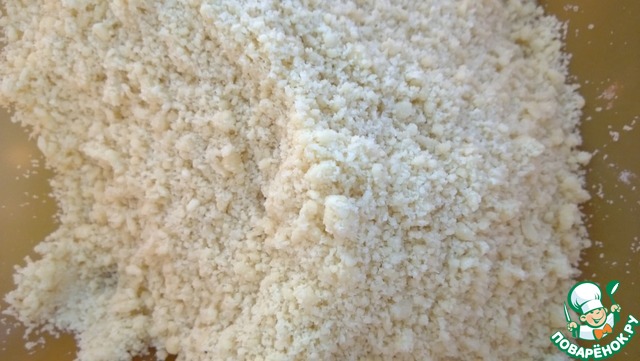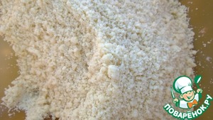 Просеиваем муку, смешиваем ее с разрыхлителем. Охлажденное сливочное масло нарезаем маленькими кубиками, и смешиваем с мукой. Растираем до состояния крошки.