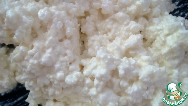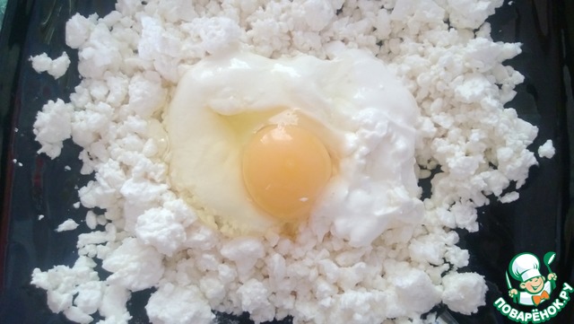 В творог добавляем сахар, ванильный сахар, сметану и яйцо. -