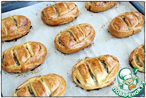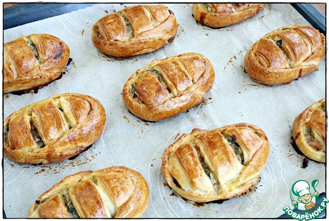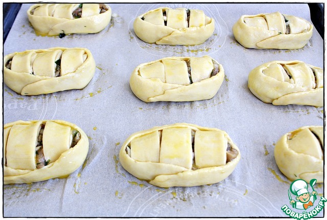 Дальше всё очень просто: все будущие пирожки смазываем яйцом и отправляем в духовку, нагретую до 200 градусов, на 35-40 минут,