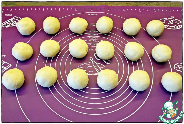 Охлаждённое тесто делим на восемнадцать равных частей и скатываем шариками. Тесто быстро нагревается и работать с ним становится неудобно, поэтому советую сложить шарики в большую посуду и отправить в холодильник, доставая по мере надобности.