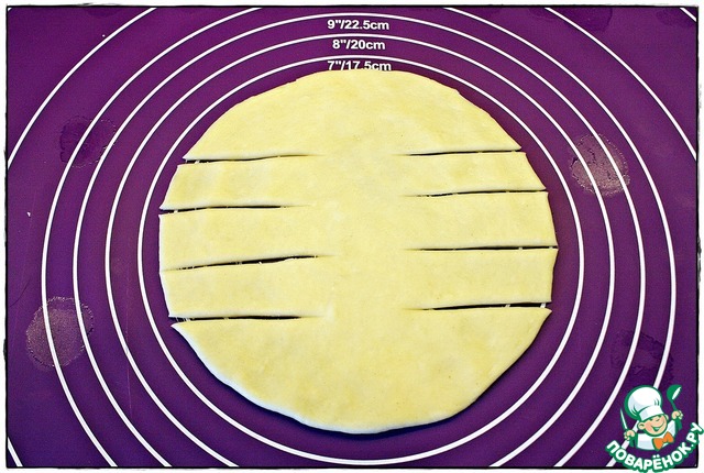 Берём шарик, раскатываем диаметром 15-16 сантиметров, делаем по четыре надреза с каждой стороны, не доходя до центра.