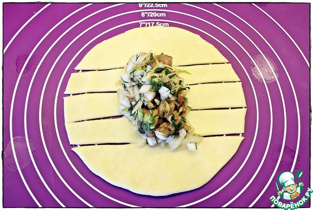 Затем в центр кладём примерно 1,5 стол. ложки начинки. Я всегда пользуюсь весами, каждая порция начинки у меня весила 47 граммов.