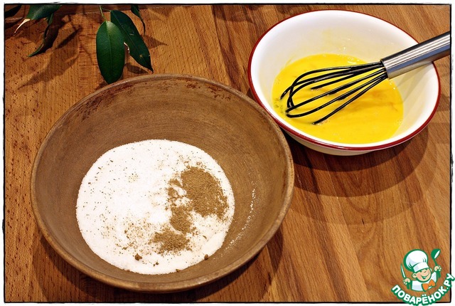 • Яйца вбиваем в мисочку, перемешиваем. В сахар добавляем корицу и тоже хорошо перемешиваем.