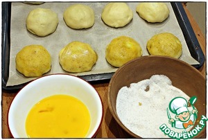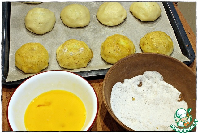 • Затем берём поочерёдно каждую заготовку и опускаем верхнюю, выпуклую часть в яйцо и затем в сахар с корицей. Так проделываем со всеми. Отправляем в разогретую духовку примерно на 35 минут. У меня духовка электрическая, я включаю режим "нижний нагрев + вентилятор" и отправляю сразу два противня на 30 минут на нижний и средний уровни.