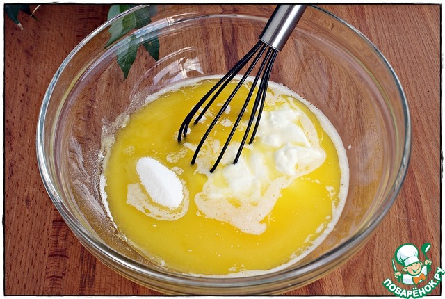 • Итак, приступим... В просеянную муку добавим разрыхлитель, перемешаем. В глубокую миску выльем растопленное сливочное масло, добавляем сметану, ванильный сахар, соль, сто грамм сахара и хорошенько перемешаем.