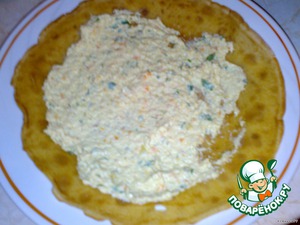 Потом кладем блин и намазываем этим паштетом.