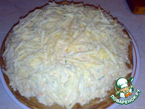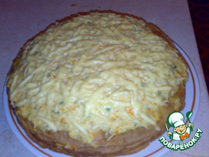 Выпекаем блины. Отвариваем куриное филе, лук с морковью обжариваем на растительном масле, все остужаем и пропускаем через мясорубку. Потом в эту массу добавляем измельченную зелень, солим и перчим по вкусу, добавляем майонез и немного бульона от курицы. Смазываем каждый блин этой начинкой, пока не закончится. Сверху посыпаем натертым на крупной терке сыром и ставим на 10 -15 минут в духовку. Достаем, нарезаем как торт и употребляем на здоровье!