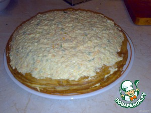 И так укладываем стопочкой, промазывая каждый блин, до тех пор пока не закончится начинка.