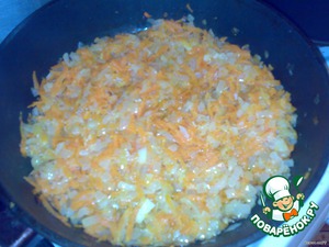 Лук мелко режем и обжариваем с натертой на крупной терке морковью и обжариваем.