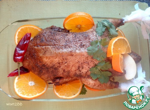 Разложить пищевую пленку, подходящую по размеру утки и рассыпать одну чайную ложку специй. Посолить утку со всех сторон, переложить на пленку со специями. Распределить оставшиеся специи по верхней и боковой частям утки.