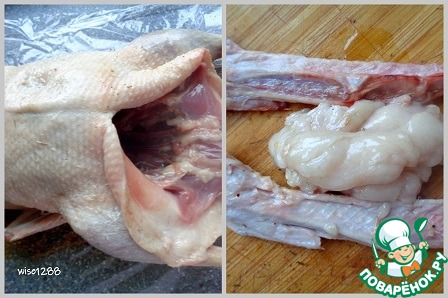 Утку подготовить к фаршированию, для этого предварительно удалить лишний жир, кисти крыла и, если необходимо - опалить.