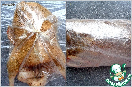 Поднять края пищевой пленки и обмотать плотно утку, если размера этой пленки недостаточно, воспользоваться дополнительной. Переложить утку в холодильник на ночь.