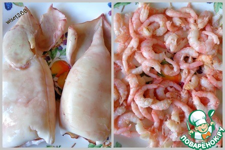 Расход воды: по литру на кальмары и креветки, пол-литра на яйца. Кальмары отварить на плите 3 минуты, с момента закипания. Воду довести до кипения, конфорку выключить и опустить креветки в кипяток на одну минуту, почистить.