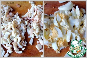 Отварить на плите яйца в течении десяти минут, с момента закипания. Кальмар и яйцо порезать.