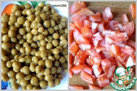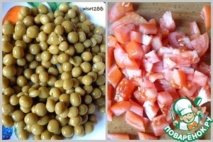 Зеленый горошек освободить от жидкости. Помидоры порезать.