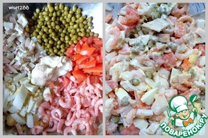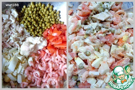 Соединить кальмары, креветки (несколько штук оставить для оформления), яйца, зеленый горошек, помидоры, посолить, заправить майонезом. Перемешать.