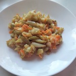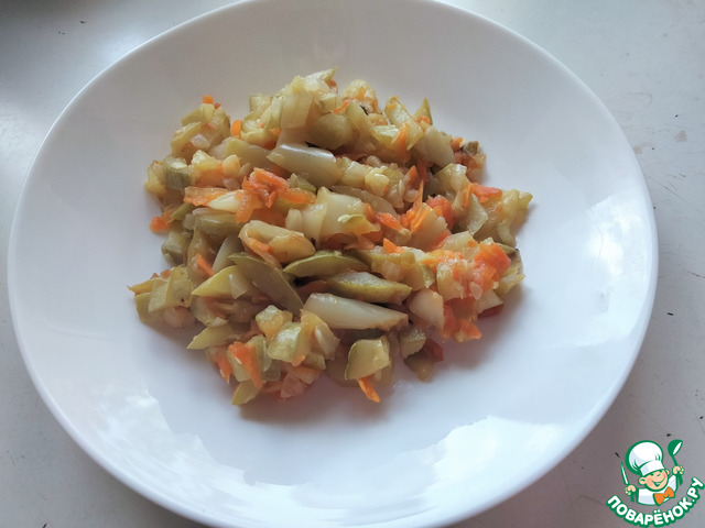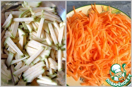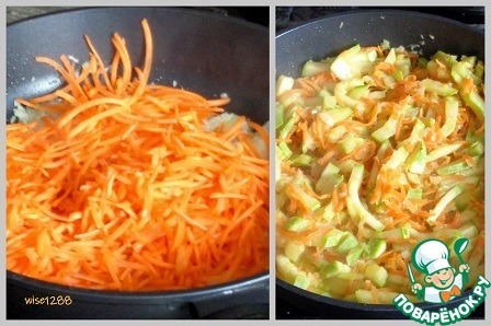 Пожарить на плите лук в растительном масле 3 минуты, добавить морковь, кабачок - продолжить жарит еще пять минут.