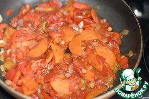 Помидоры ошпариваем, снимаем кожицу, режем кубиками, кладём к овощам.