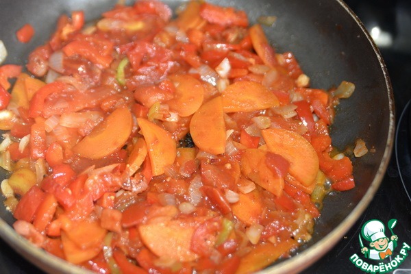 Добавляем соль, сахар, уксус, смесь перцев, перемешиваем, тушим на среднем огне около 15 минут до готовности. -