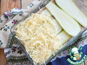В емкость для запекания выкладываем тонко нарезанные полоски кабачка.