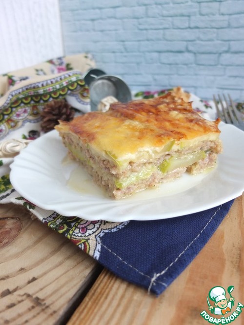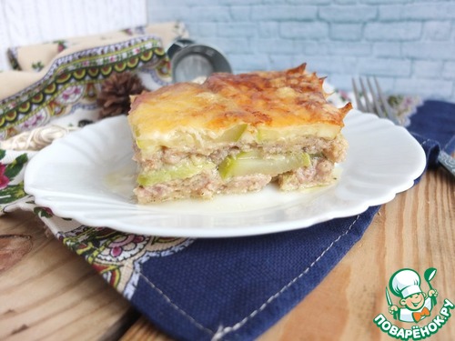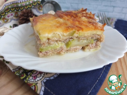 Следом слой кабачков, затем мясной и сверху снова кабачки.