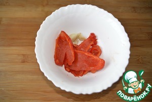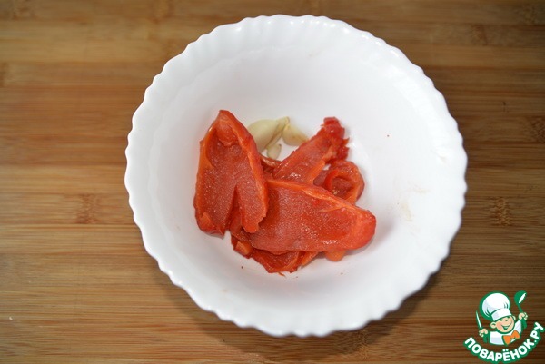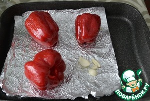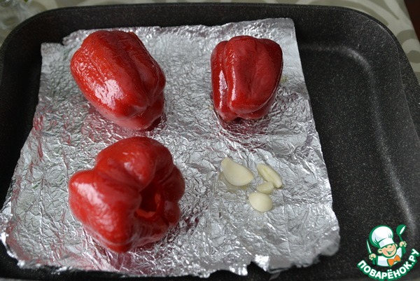 Снимаем с перца кожуру, режем, пробиваем блендером вместе с запечённым чесноком.