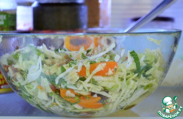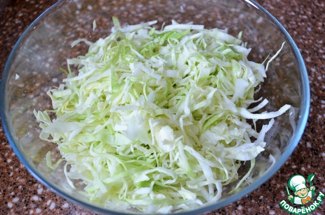 Капусту нашинковать мелко, добавить щепотку соли и сахар, слегка перетереть руками.