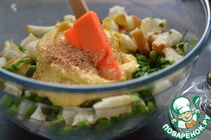В миске смешать рогалики, зеленый горошек, масло, мускатный орех, петрушку.