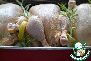 Разложить между цыплят веточки розмарина и дольки лимона.