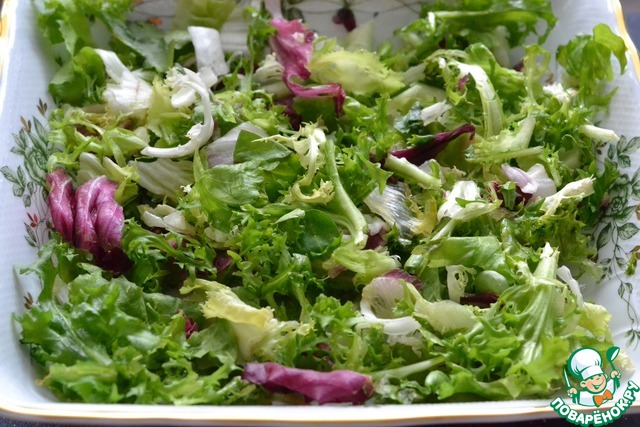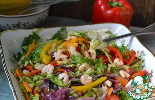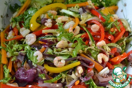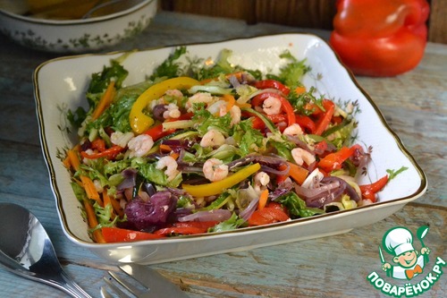 На листья салата выложить еще горячие овощи и креветки, не смешивая их.