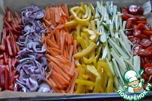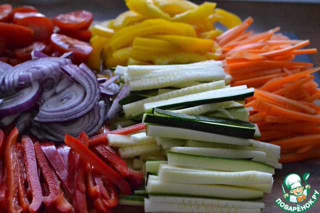 Помидоры, цуккини, перец желтый, морковь, лук красный, перец красный -