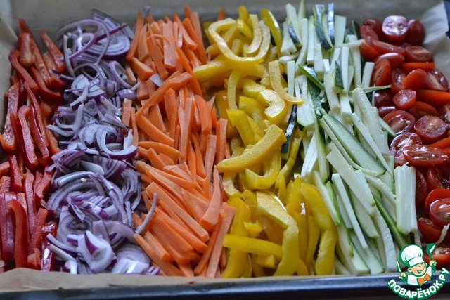 Противень для запекания простелить бумагой для выпечки и выложить нарезанные овощи рядами.