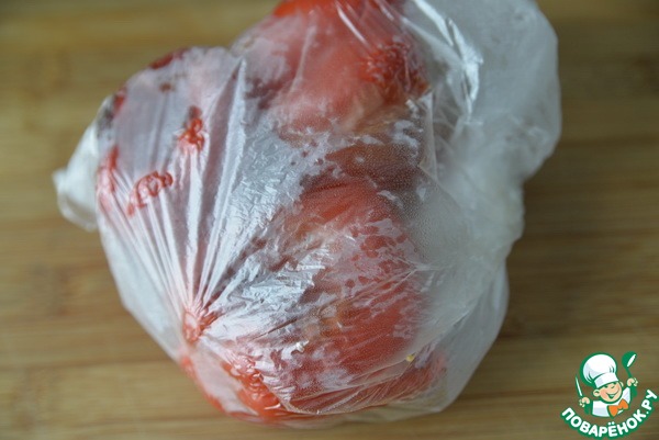 Далее горячие перцы кладём в пакет, завязываем, отставляем на 10 минут.