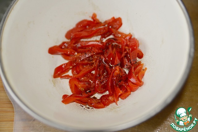 После этого кожица с перца легко удаляется. Режем перец соломкой.