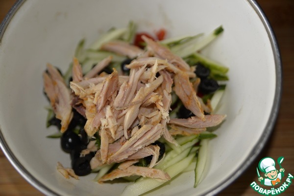 Куриное филе режем полосками. У меня филе с запечённых куриных голеней. Я предпочитаю "красное" куриное мясо "белому", это на ваше усмотрение.