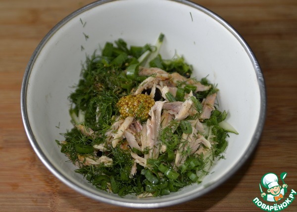 Кладём в салат рубленные укроп и зелёный лук. Добавляем по вкусу соль, смесь перцев, горчицу, оливковое масло.