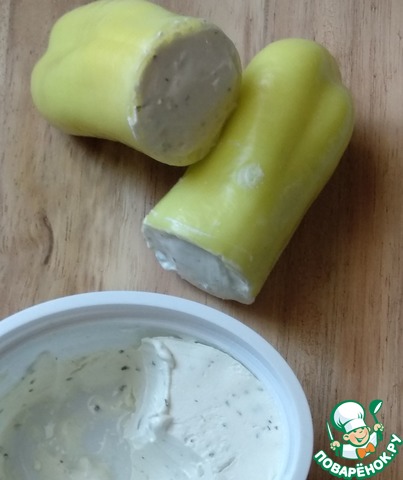 Перец помыть, очистить от семян, нафаршировать творожным сыром и убрать в холодильник.