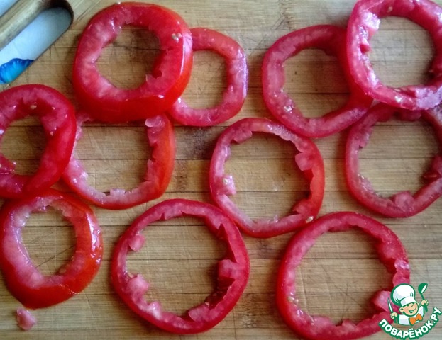 Помидоры помыть, нарезать кольцами, извлечь мякоть.