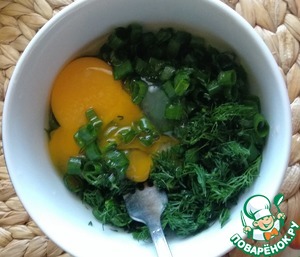 Зелень (у меня укроп и зелёный лук) промыть и мелко порезать. Соединить с яйцами (2 шт) и солью (1/4 ч. л.). Хорошо взбить.