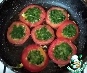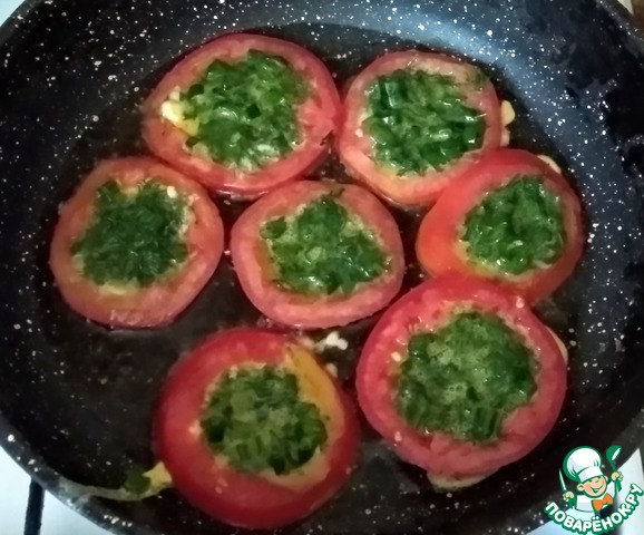 На разогретую сковороду, смазанную оливковым маслом (2 ст. л.), выложить кольца помидор, в них разлить взбитые яйца с зеленью, обжарить с двух сторон.