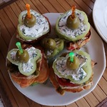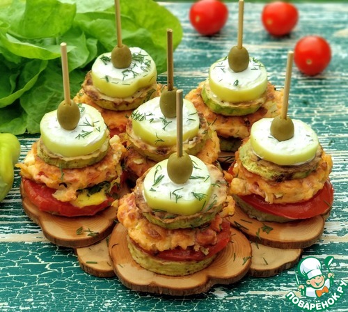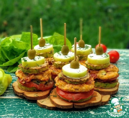 Далее соберём башенки. Сначала кабачки, затем помидоры с омлетом, оладушки, кабачки и нарезанный фаршированный перец.