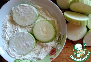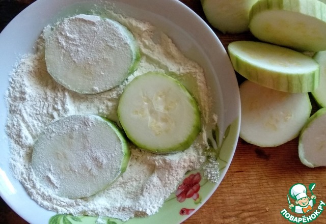 Кабачки помыть, очистить от кожуры, нарезать кружочками. Неподходящие по размеру для будущих башенок отложить. Остальные обвалять в муке (2 ст. л.), смешанной с солью (1/4 ч. л.)