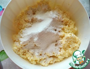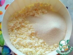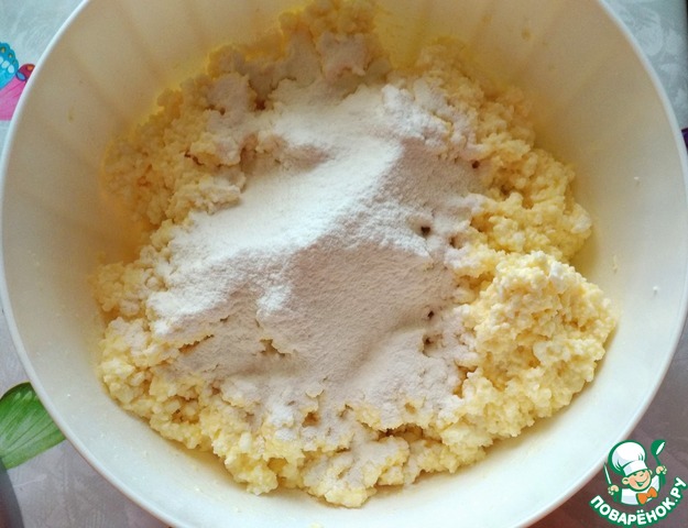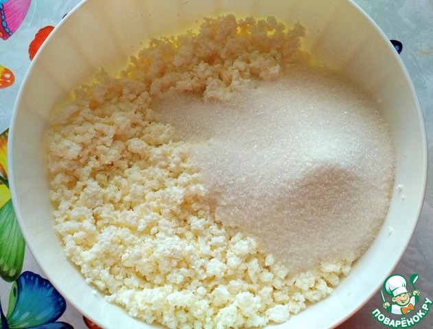 Творог размять вилкой. Лучше выбирать творог не пастообразный, а более сухой, у меня был деревенский.