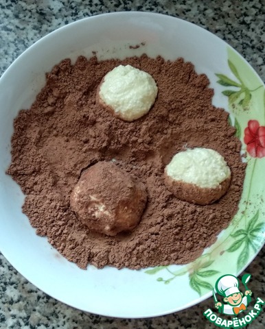 Из полученной творожной массы влажными руками сформировать шарики, величиной чуть больше грецкого ореха. Обвалять их в какао.